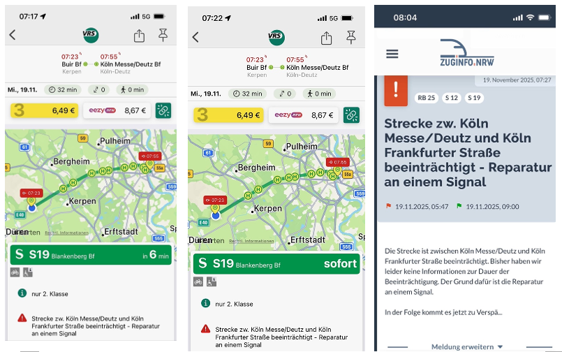 wie mir aus der Buirer Bevölkerung berichtet wurde, gab es wieder einmal Probleme mit der S-Bahn in Buir. Durch einen Signalausfall zwischen Köln-Deutz und der Frankfurter Straße kam es im S-Bahnverkehr zu Problemen, die dazu führten, dass am Buirer Bahnhof zumindest zwischen 7:00 und 8:00 alle S-Bahnen in Richtung Köln als „fällt aus“ angezeigt wurden. Zeitgleich wurde jedoch in der VRS-App angegeben, dass die S-Bahnen verkehren würden, wenn auch verspätet. Auch auf zuginfo.nrw wurde über Verspätungen informiert, von Zugausfällen war hier ebenfalls nichts zu finden.